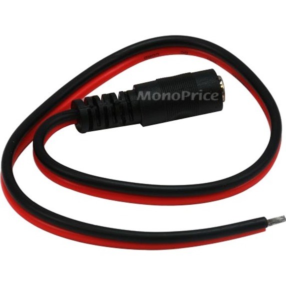 Use this DC power pigtail to connect your security cameras to your power distribution system or power adapter. It features a female coaxial power plug on one end to two bare wires on the other. Black and red wire jackets indicate polarity. Approximately 10 inches in length. It provides a simple solution for power connectivity.