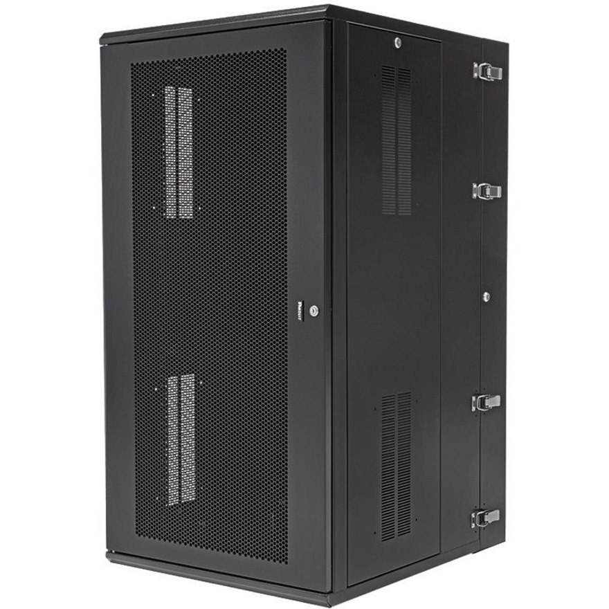 The PanZone® Wall Mount Cabinet with perforated door is 30 inches deep and includes hinged doors on the front and back for complete access to networking equipment to make moves, adds, and changes easy. The removable side panels allow for access to cable routing. The enclosure is engineered to allow proper climate control for use with various networking equipment. The 26 RU enclosure is rated to 350 pounds and is black.